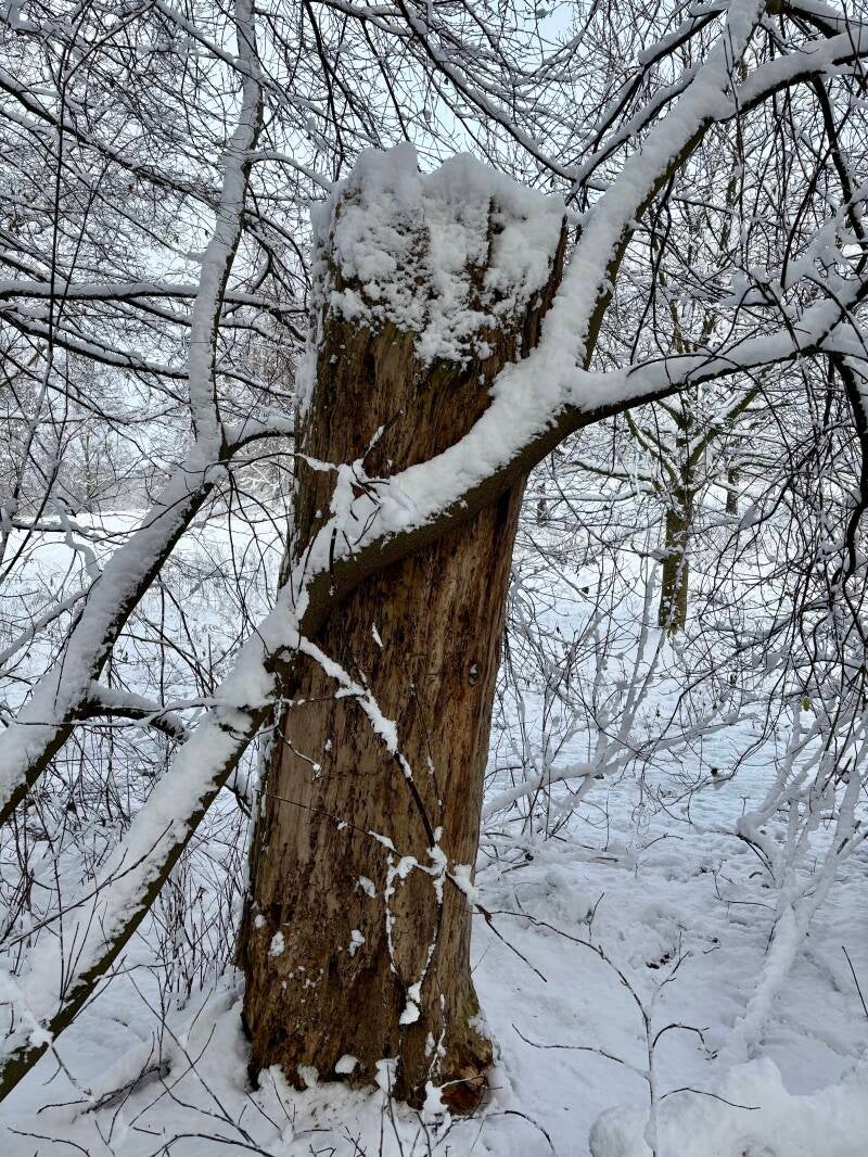 Nog steeds is een deel van de inmiddels vermolmde stam zichtbaar, als stille getuige van dit verhaal (foto links: januari 2026)
