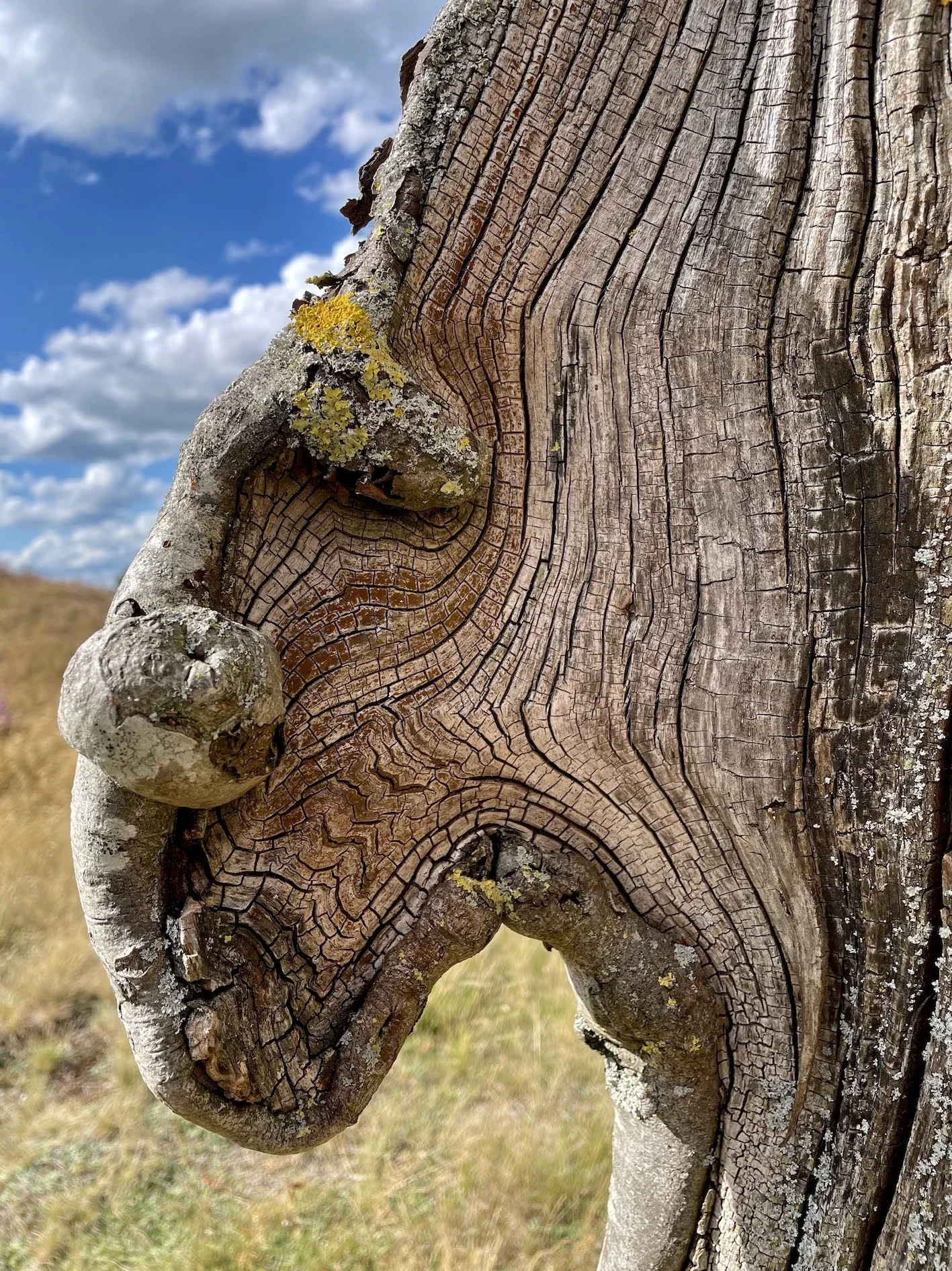 Tijdens de zomervakantie in 2022 stond deze ogenschijnlijk fors gehavende boom te stralen in een droog en schraal landschap en trok mijn bijzondere aandacht.